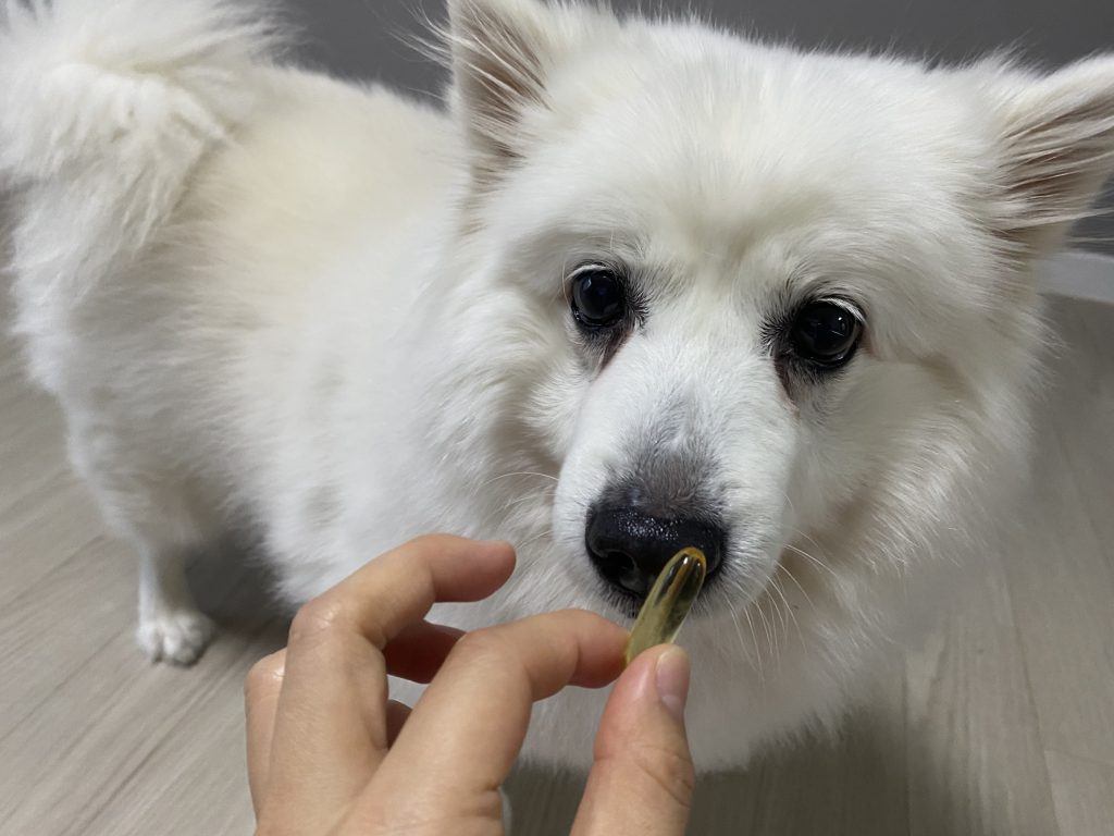 몽이언니: 알약이 너무 커서 강아지에게 삼켜서 먹이기엔 무리가 있어요. 또한, 9kg 기준 하루 1캡슐 급여라, 소형견이라면 2~3일에 나눠서 먹여야 해서 산패 걱정이 조금 됩니다. 이런 경우, 산소가 최대한 닿지 않도록 바늘로 뚫어서 급여 후 보관해야 할 것 같아요.