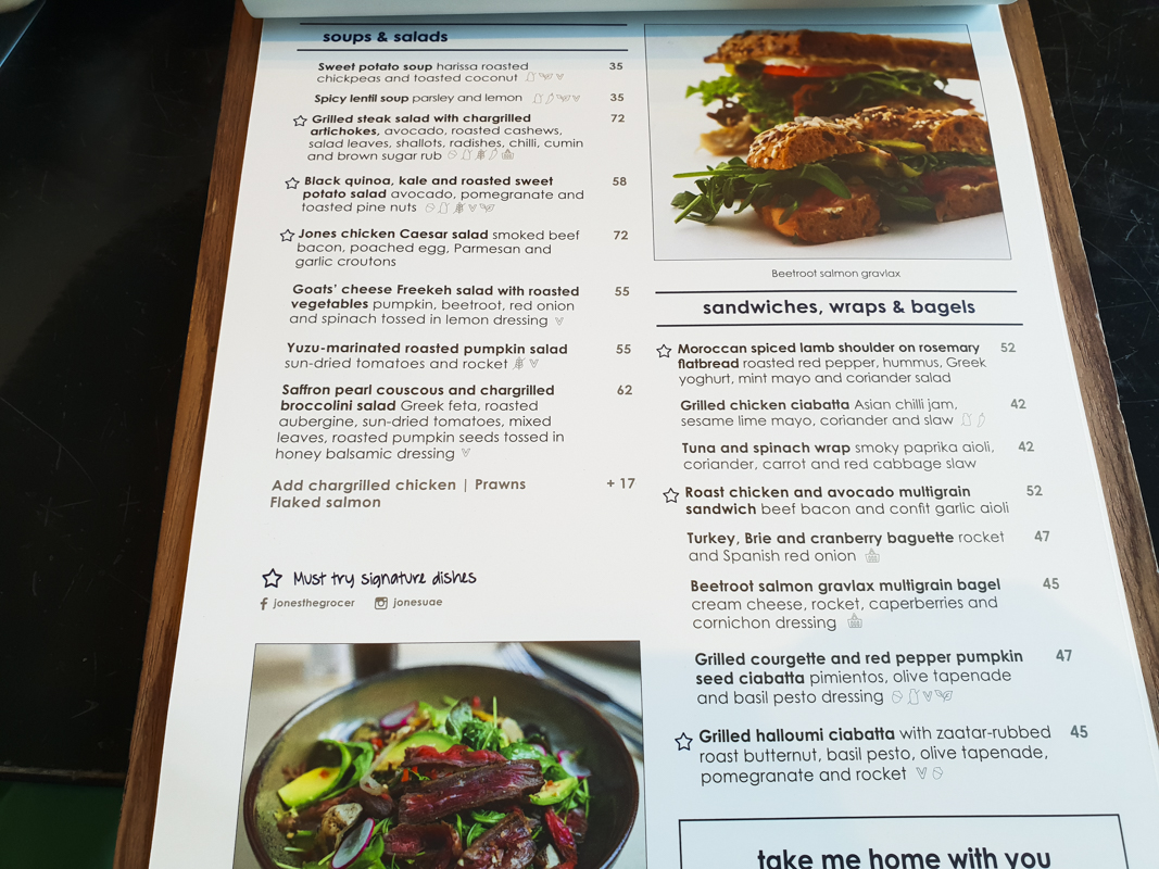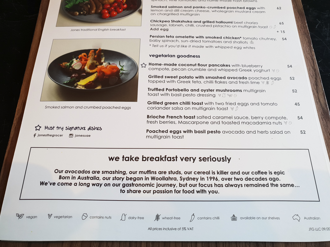 아부다비에 있는 존스 더 그로서는 직접 방문 시 Breakfast 또는 Main Course에 한해 1+1 엔터테이너 쿠폰을 이용할 수 있으며, zomato 앱을 이용한 배달 주문도 가능하다. 아침식사 메뉴는 다음과 같으며 주중 오후 12시, 주말 오후 4시까지 이용 가능하다.