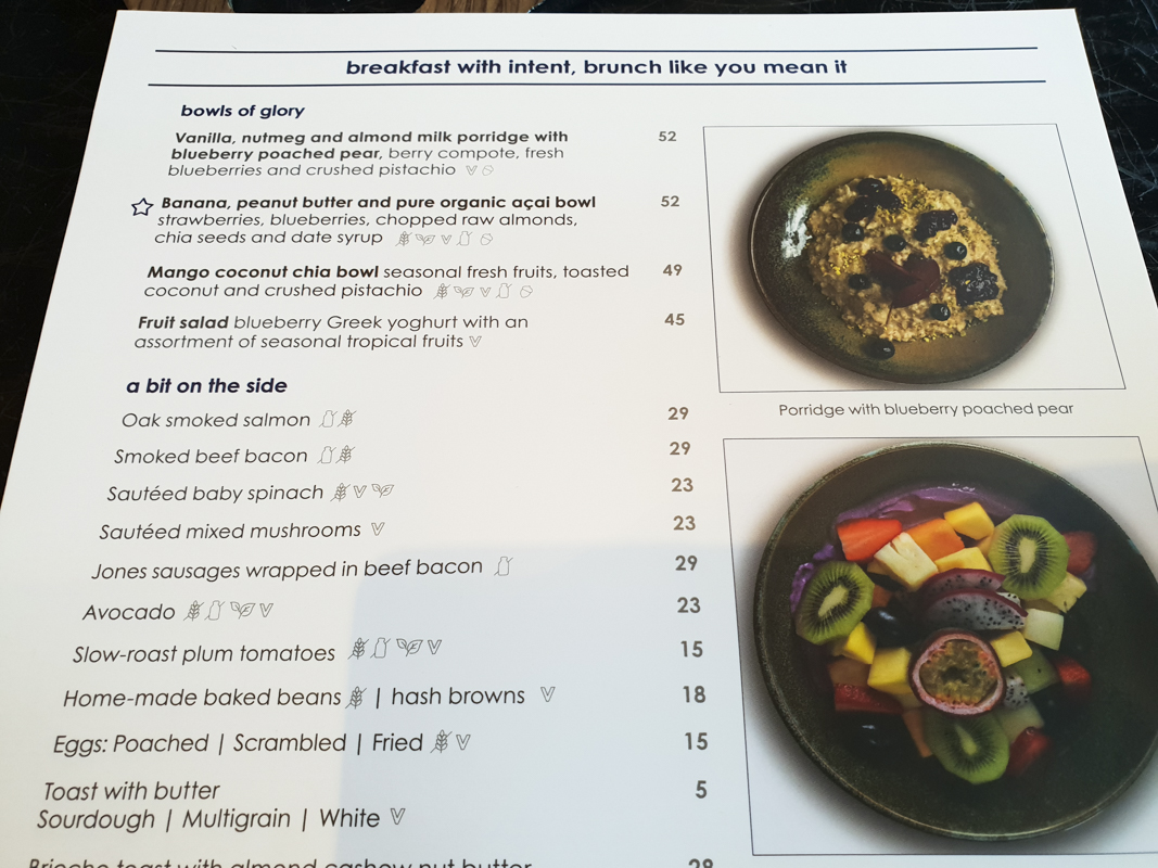 비건을 위한 아침식사로는 Banana, peanut butter and pure organic acai bowl과 Mango coconut chia bowl, 그리고 Truffled Portobello and oyster mushrooms가 제공된다.