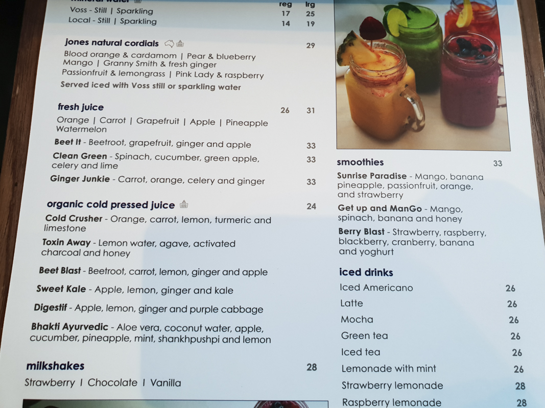음료로는 신선한 주스와 스무디 커피, 차 등이 제공되며, 추가 요금을 낼 경우 우유 대신 아몬드 밀크나 코코넛 밀크를 이용할 수 있다. 이곳에는 맛있는 케이크와 타르트도 꽤 있지만 아쉽게도 비건을 위한 디저트 메뉴는 없다.
