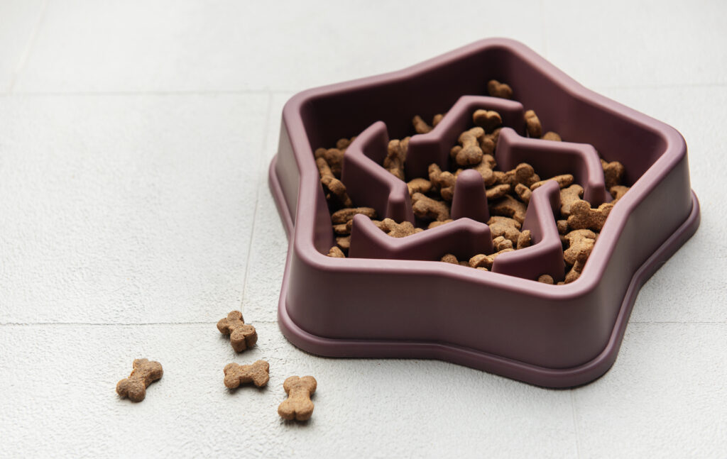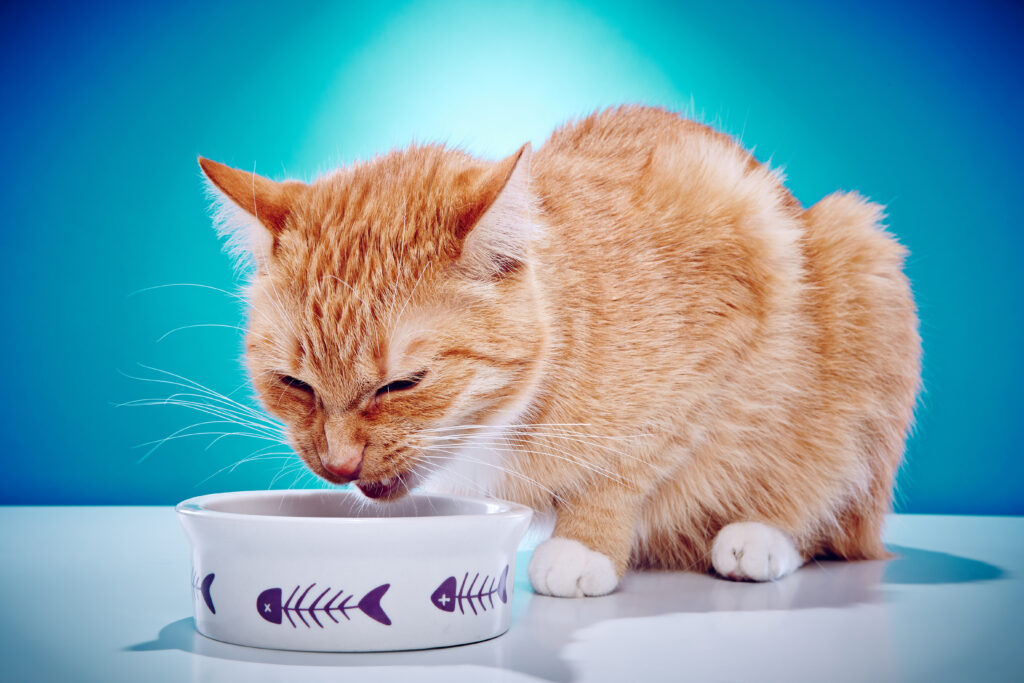 - 급하게 먹는 고양이라면 ‘슬로우 피더 그릇’ 또는 구슬, 작은 돌기 등이 있는 급식기를 사용해 식사 속도를 조절해 주세요.